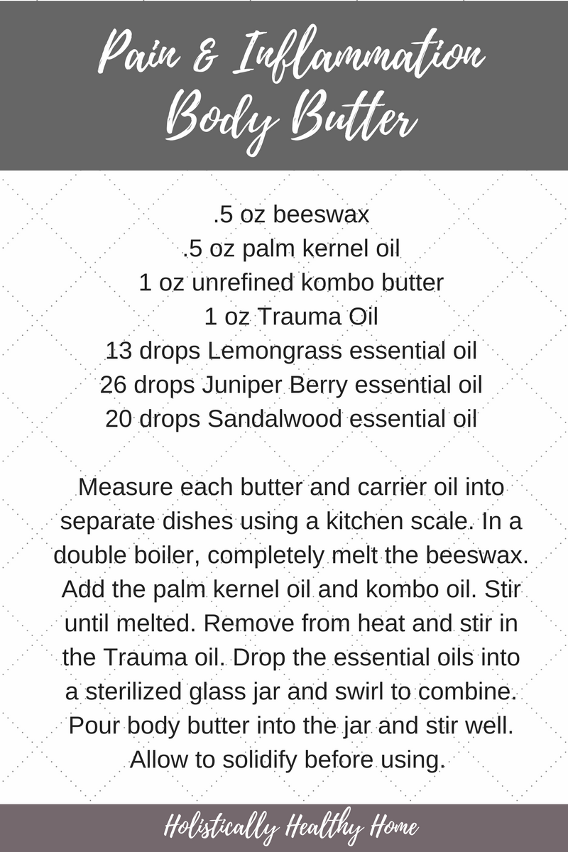 There are many other analgesic (pain reducing) and anti-inflammatory essential oils that could have been included in this blend. Black Pepper, Clove, Ginger, Peppermint, Helichrysum, Ho Wood, Rosewood, Lavender, Eucalyptus, Roman Chamomile, Clary Sage, or Basil, just to name a few. I purposefully avoided stimulating oils, such as Peppermint, Ginger, and Black Pepper, as I intended this body butter for use in the evening before bed.
