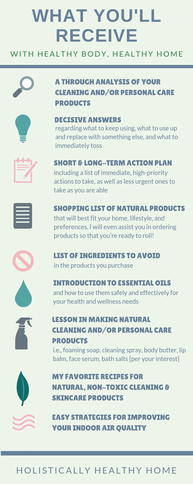 Then we work together to replace the old stuff with beautiful, natural, effective products that will decrease your body burden while nourishing and supporting your body, health, and overall wellness.